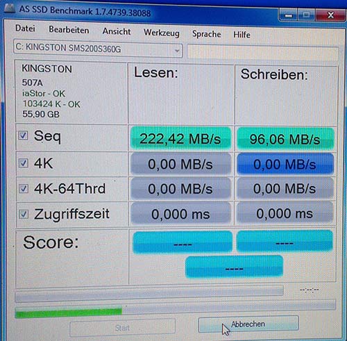 Wundere Dich nicht, wenn die Schreibrate noch mal etwa um 1/3 einbricht, dass ist bei den SSD mit Sandforce normal und wird als Übergang vom Neu- in den Normalzustand angesehen. Es passiert, wenn alle NAND Pages schon wenigstens einmal beschrieben wurden. Hättest Du vorher hier gefragt, hätten wir Dir die m500 120GB (für 10€ mehr die Doppelte Kapazität!) oder die Plextor m5m 64GB bzw. die neue Plextor m6m 64GB empfohlen, wenn es wirklich nur 64GB sein sollen.