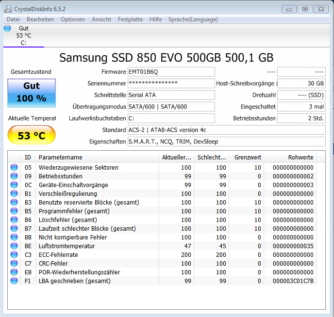Die 4k_64 Lesend sind zu hoch, da cacht etwas denn mehr als 400MB/s gehen über SATA 6Gb/s bei so kurzen Zugriffe wegen des Overheads nicht rüber. Das kommt aber öfter vor und ist kein Grund zur Sorge. Die 53°C auch nicht, CDI hat nur eine pauschale Warngrenze von 50°C, SSD sind aber i.d.R. für bis zu 70°C Betriebstemperatur ausgelegt, 53°C oder auch 55°C sind also überhaupt noch kein Grund zu Sorge.