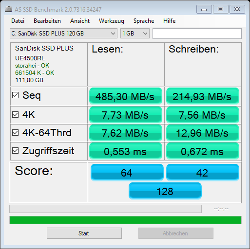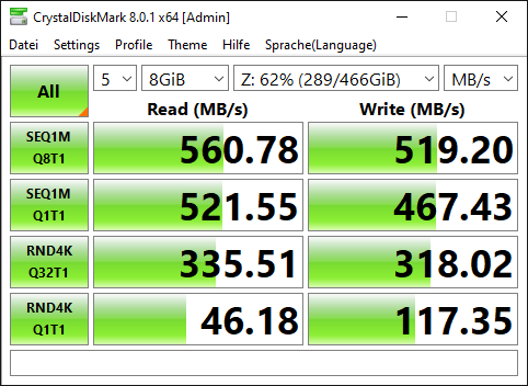 Sieht für mich wie ein ziemlich typisches Ergebnis für eine MX500 aus, sieh zum Vergleich z.B. Beitrag #2.649Finsk schrieb:Hallöchen, neue Crucial MX500 mit 500GB, drauf ist nur Steam-ARK komplett mit ~265GB, vergleichsweise sehe ich in anderen Tests deutlich bessere 4K Werte, ist das denn wichtig für mich?