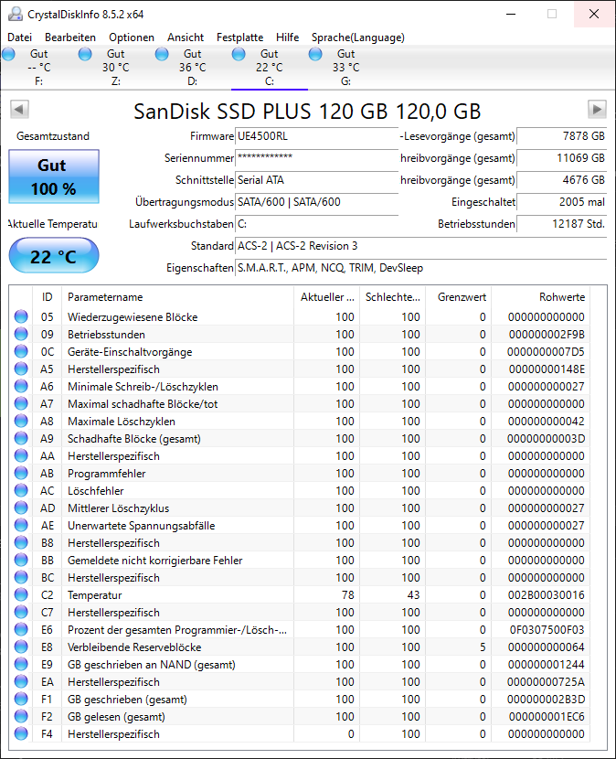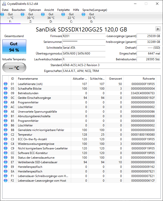 Bezüglich dem Gesamtzustand: Wie genau der berechnet wird ist von Hersteller zu Hersteller unterschiedlich und ich kann dir nicht auswendig sagen wie Samsung das macht, aber ich würde mir da erst wenn der Wert einstellig ist ernsthaft Gedanken drüber machen.