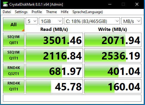 As-SSD bei Dir ist Uralt-Version, bitte aktuelle benutzen. Und natürlich zum Vergleichen gleiche Benchmarks benutzen - Werte aus As-SSD und CDM sind nicht direkt vergleichbar, andere Queues/Threads/MiBs-MBs usw..., sprich: es ist normal in As-SSD etwas weniger zu haben. Um Hersteller-Angaben zu prüfen ist dann eher CDM und ATTO brauchbar.Gethema schrieb:Umstieg von einer SATA Crucial MX300 525GB (ca. 4J alt) auf eine NVMe Crucial P5 2TB, System frisch aufgesetzt.
