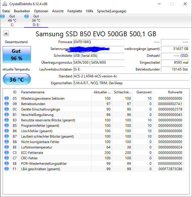 ich habe hier noch eine Samsung 850 EVO, die ich als externe Festplatte benutze. Kann mir jemand sagen, ob da alles in Ordnung ist?