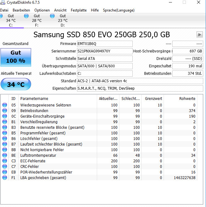 angesichts meiner heute eingebauten 850 Evo 1TB wollte ich mal meine SSDs kontrollieren ob bei Werte bei denne passen.