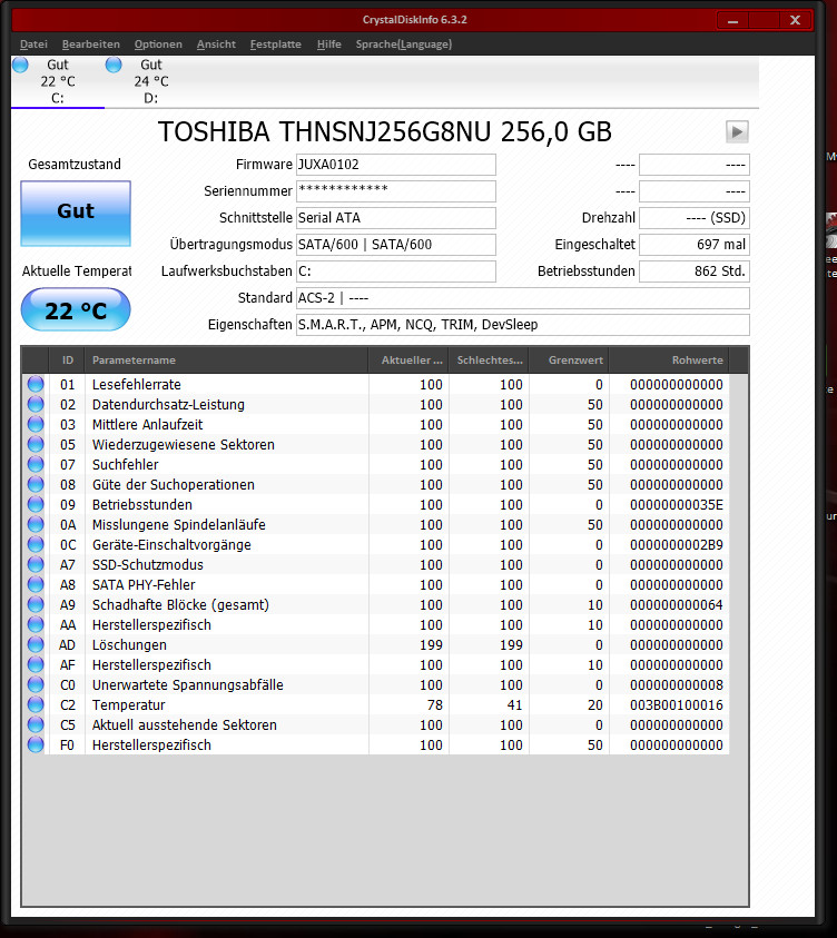 Einige Attribute sind aber auch standardisiert und damit eigentlich immer gleich, bei anderen hat CrystalDiskInfo offenbar die Namen von Toshibas HDDs verwendet, aber andere wie die Temperatur stimme, da ist der Aktuelle Wert 100-Temperatur und die Temperatur steht auch im letzten Byte im Rohwert. Da sonst alle aktuellen Werte auf 100 und damit dem Ausgangswert stehen, findet zumindest der Controller alles bestens.