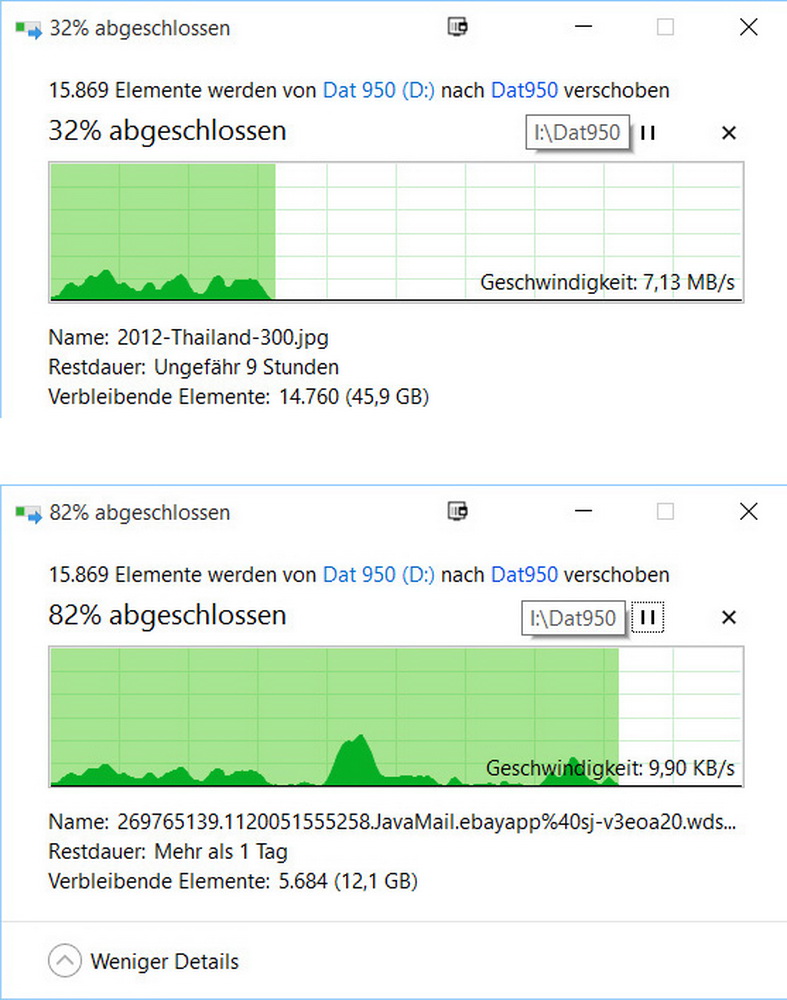 Wenn ich also nur kopiere, geht es mit über 600MB/s. Das anschließende Löschen geht wieder mit 0,6 Dateien/s.