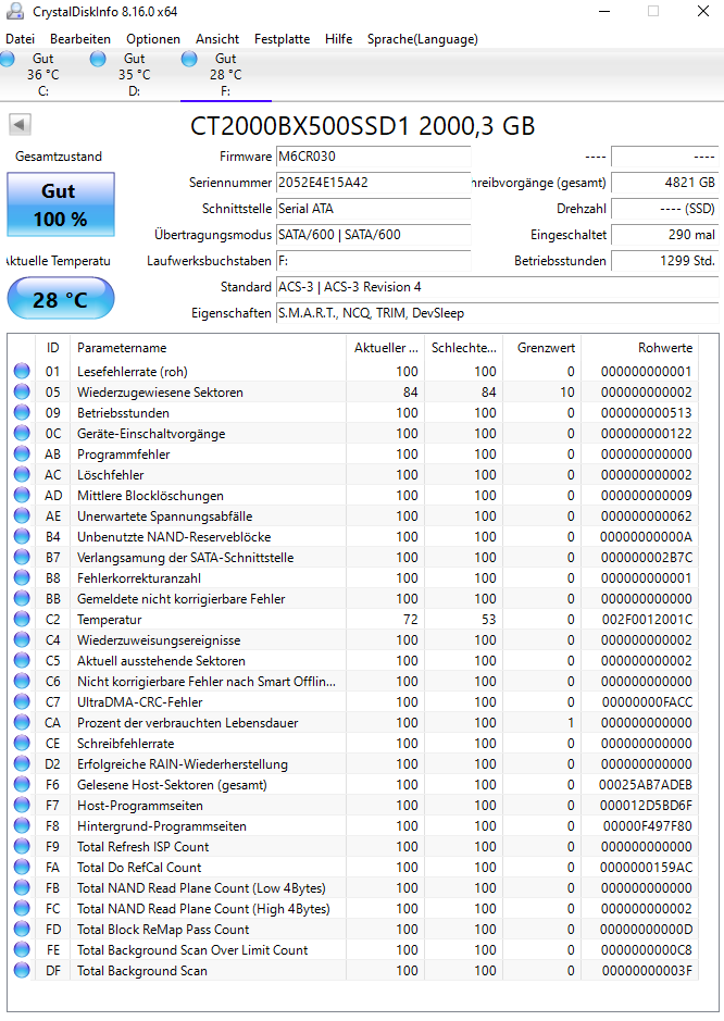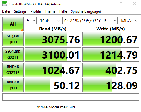 3400 lesen, 3000 schreiben. Die SSD hatte bis zu 61°C beim Klonen, bis 58°C beim CDM Test, etwa 46°C beim Zocken und 42°C im Windows. Soweit so gut. Die neue SSD lief super, einen ganzen Tag lang.