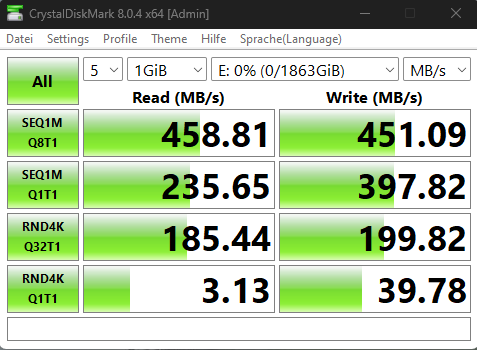 @deo Nope, springt nicht hoch, bleibt immer bei ca. 220 mb/s (inzwischen ist der Wert leicht höher)... An meinem Windows Rechner hab ich ca. 500 mb/s schreiben...