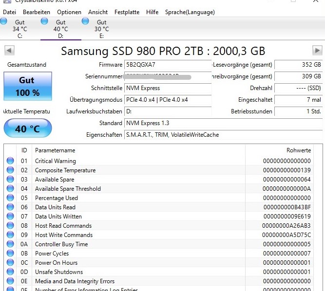 Habe CrystalDiskInfo noch nie benutzt und bin daher unsicher bzgl. der Interpretation der Werte. Unten in der Tabellenansicht steht soweit ich das sehe nur Grütze (alle Werte auf 99 oder 100), oben in der Übersicht hingegen steht 30 TBW, 41 mal eingeschaltet, 87 Betriebsstunden, ist das so richtig und kann man den Werten vertrauen? Da Samsung fast 3 PBW als Lebensdauer angibt ist da erst 1% "verbraucht". Kann man also so benutzen, oder? Gibts noch andere DInge, die ich beachten müsste? SSD ist via USB Gehäuse angeschlossen, da ich keinen Win-PC mit "echtem" SATA habe. Die SSD soll dann als Datengrab im NAS mein RAID 1 aus 2 8 TB Platten ersetzen, auf dem überwiegend gelesen wird und selten geschrieben.