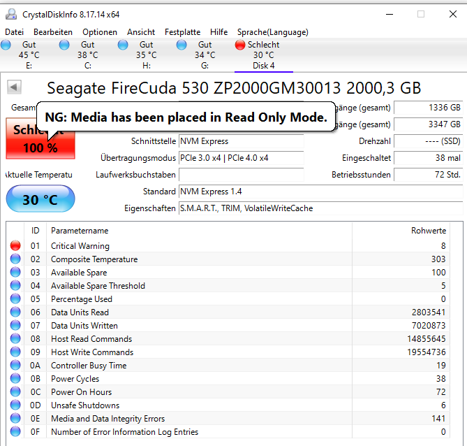 Guten Tag, die M.2 SSD ist noch nicht recht alt und hat auch nicht viele Daten gesehen. Bisher hat sie eine einem PC einwandfrei funktioniert. Seit Wechsel auf den alten PC (X99-Board) wird die SSD binnen Minuten extrem heiß, ohne belastet zu werden. Ein paar Tage hat sie einwandfrei funktioniert. Soeben passiert folgendes: Wird nicht in Windows erkannt, CDI sagt Readonly Mode. Ich kann jedoch schlägt das zuweisen des MBR (diskmgmt) fehl. Den anderen PC gibt es nicht mehr. Ideen?