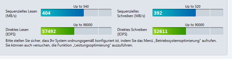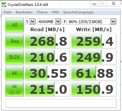Natürlich habe ich werend das bord unterwegs zu asus war auf ein alltes system zurück gegriffen und in dieser zeit spanne auch die SSD Bekomen^^ JUHU^^ mit dem Ersatz system (älteres Asus bord mit i7 870 etc) lief die SSD ein Ticken Schneller wobei ich hierzu sagen muss das ich nicht erwarte an die "test ergebnise des Herstellers heranzu komen jedoch schon zumindest gerne in die nähe komen würde, was wie ihr im obrigen screen sieht ist das jedoch Leider weniger der fall.
