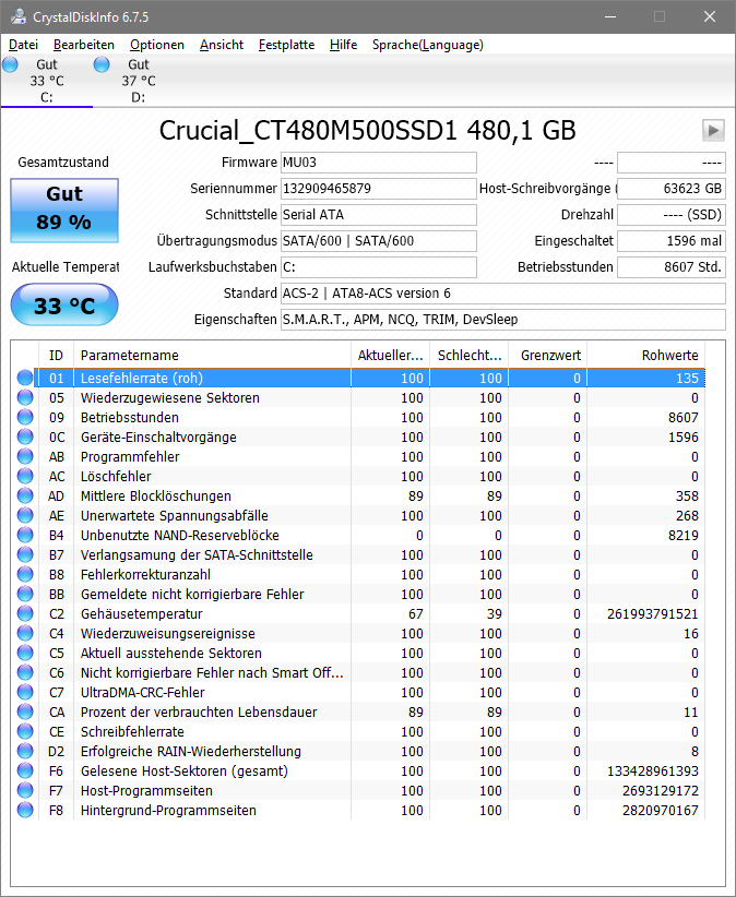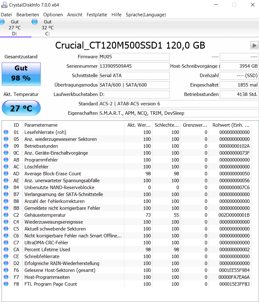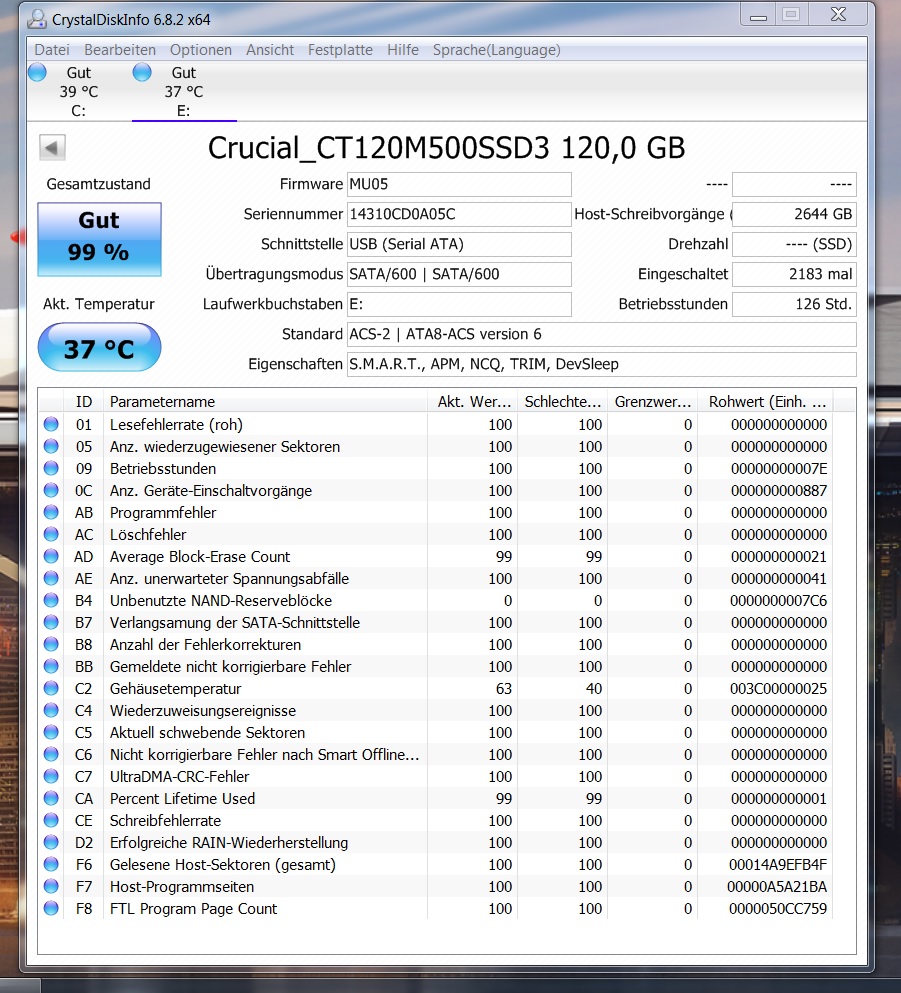 Kenmeri, da ist alles in Ordnung, die NANDs haben gerade erst 33 von den 3000 spezifizierten P/E Zyklen runter, daher auch die 99% in der Anzeige bei CrystalDiskInfo. Auch SSDs brauchen Kühlung, also einen kühlenden Luftstrom und die m500 hat in Idle ohne LPM rund ein Watt Leistungsaufnahme, aber selbst 50 bis 60°C sind für eine SSD noch unkritisch, auch wenn CrystalDiskInfo dies anderes darstellt. Bei so wenig Betriebsstunden und so viele Einschaltungen dürfte sie vorher mit LPM gelaufen sein, denn dann zählt die m500 nur die Zeit in der die SATA Lane aktiv ist. Wenn also die Betriebsstunden scheinbar zu langsam gezählt werden, dann ist einfach nur LPM aktiv.