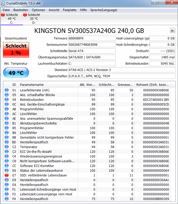 Warum die restliche Lebensdauer bei 1 (1%?) liegen soll, ist mir schleierhaft, wenn die SSD erst 5k Std.