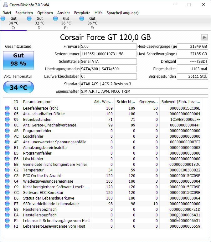 Erstens: Ziehe bitte das Fenster soweit auf, dass alle Attribute und auch die Rohwerte vollständig sichtbar sind!