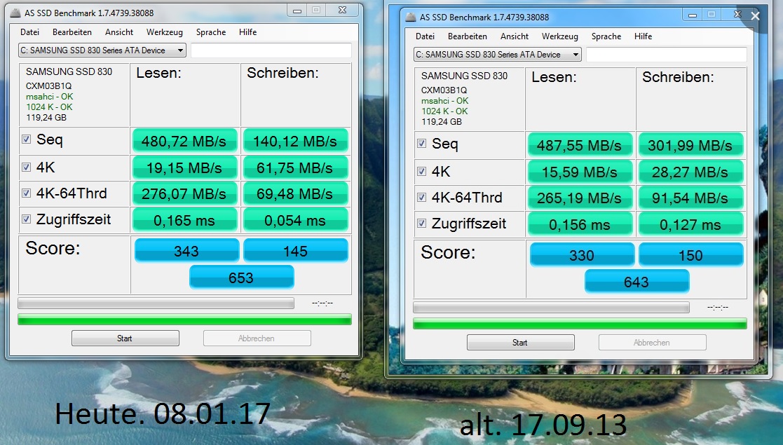 Habe heute mal wieder den AS SSD Benchmark laufen lassen um zu sehen ob meine gute alte 830er noch so läuft wie früher. Das Ergebnis hat mich jetzt jedoch sehr überrascht. Handelt es sich hier um normale Alterung? (25 von 120 GB sind aktuell frei, damals sicher etwas mehr)