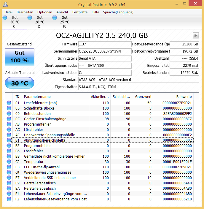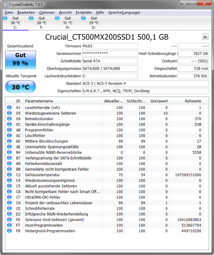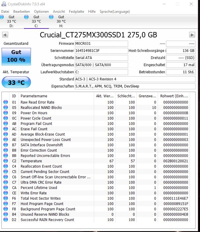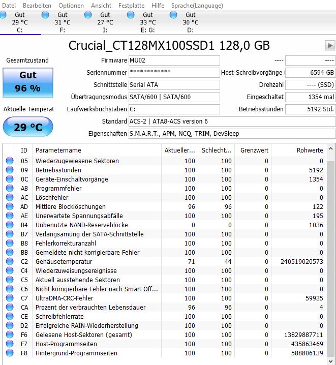 ich hab keine wirklichen Bedenken aber ein kurioses Phänomen. Die Crucial MX200 hab ich seit Januar 2016 zunächst nur für Spiele, ab Mai 2016 als Systemplatte benutzt. Ich würde davon ausgehen, dass mein Rechner täglich 6-8 Stunden läuft (eher mehr).