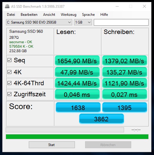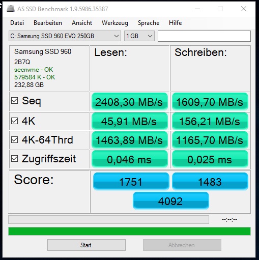 Benche mal mit CrystalDiskMark, da sollten die Werte besser als bei AS-SSD sein, wie gesagt schafft es AS-SSD nicht die maximalen Werten bei so schnellen SSDs zu ermitteln.