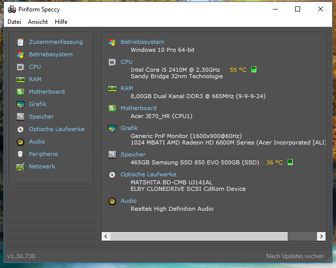 Für die Anzeige der S.M.A.R.T. Werte bevorzuge ich CrystalDiskInfo, aber Dein Tool scheint ja die korrekten Namen der Attribute auch zu kennen und die Werte sehen auch alle gut aus. Die NANDs der 830 haben erst 10% der spezifizierten P/E Zyklen runter, sind also noch fast neuwertig. Auffällig ist nur die recht hohe Zahl der unerwarteten Spannungsabfälle (EB), die bei der 850 Evo fast dreimal so hoch wie bei der 830er ist, obwohl die ja jünger ist und viel weniger Betriebsstunden und Einschaltvorgänge hat. Wurde die 850 Evo vorher in einem anderen Rechner betrieben? Wenn nicht und sie neu war als sie in den Rechner gekommen ist, würde ich mal deren Spannungsversorgung prüfen und beobachten ob der Wert bei der weiter so ansteigt oder sich womöglich während des Betriebs gar erhöht.