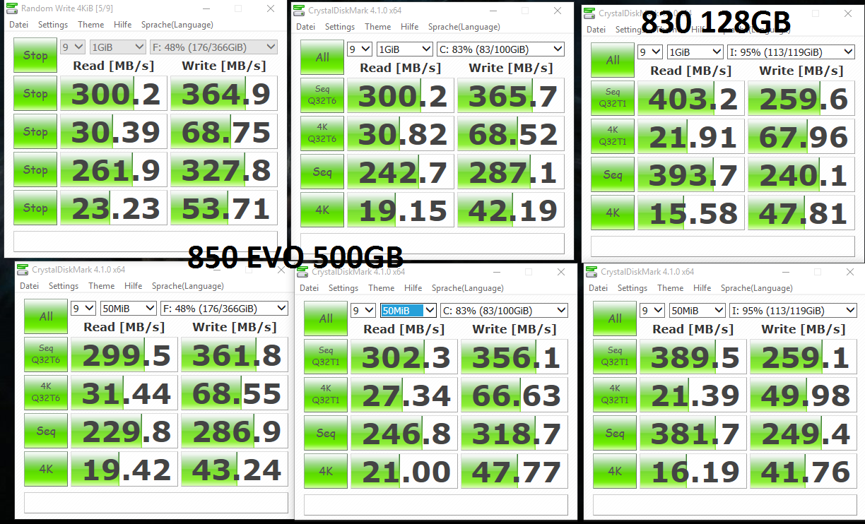 Die 4k und vor allem die 4k Lesend sind für das Systemlaufwerk am relevantesten, die 4k_64 sind egal, da man praktisch nie mehr als maximal 4 parallele Zugriffe auf das Systemlaufwerk haben wird, zu zumeist dürfte sogar immer nur ein Zugriff zur Zeit erfolgen. Die 4k Lesend der 850 Evo sind aber bei Dir sehr schwach, die hängen sehr vom System und dessen Energiespareinstellungen ab. Was für ein Mainboard hast Du?
