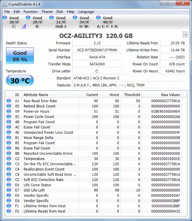 Habe die erste Hälfte dieses Teil VIII-Threads gelesen, von daher nehme ich an, dass ich einfach schlechte Qualität habe. Ich zeig euch trotzdem mal die CrytalDiskInfo-Werte, ich hoffe, ihr könnt mir erklären (hab schon gelesen, dass Kingston wohl bei den SMART-Werten lügt), wie lange die SSDs noch halten, was da verbaut wurde und wieviel Speicherplatz ersetzt wurde. Ich frage mich: wenn die Schreibgeschwindigkeit früher 5mal so hoch war, wurden dann 1 GB Benchmarkzellen durch schlechtere ersetzt? Der Speicherplatz ist nicht kleiner geworden und Windows war früher auch schon drauf, wo die Werte noch passten. Kapier ich nicht.