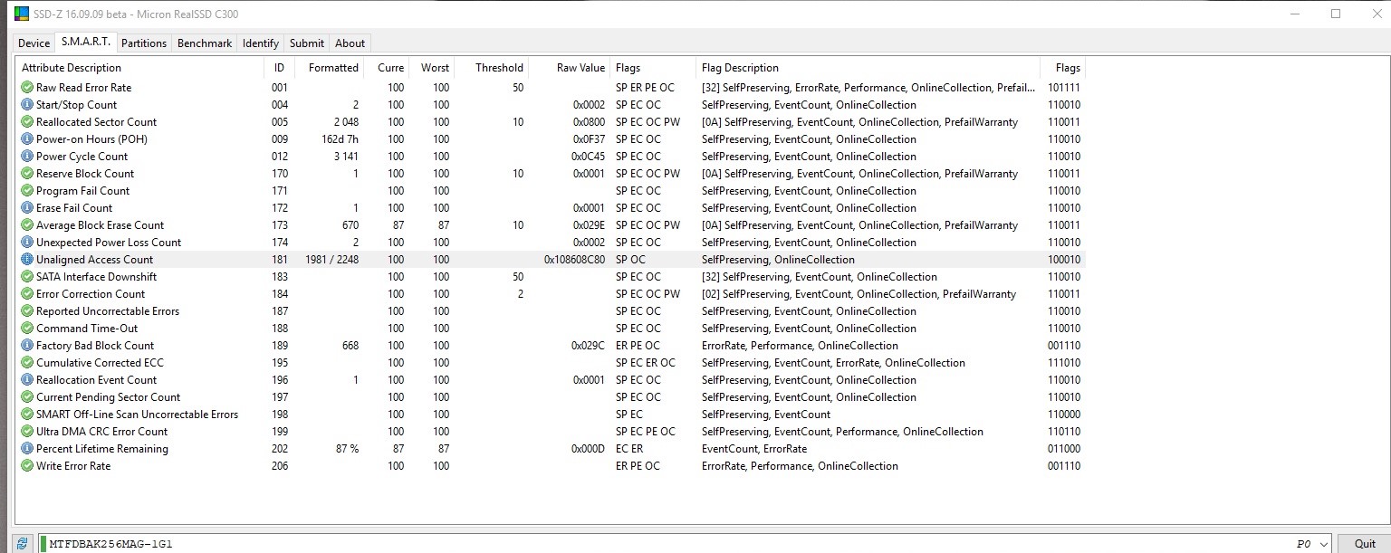 Selstsam das CrystalDiskInfo die Namen der Attribute der Crucial C300 nicht mehr kennt. Die Anzeige bei SSD-Z (das Tool ist besonders tool, den Benchmark kannst Du für SSDs gleich ganz vergessen, da es ein Low-Level Benchmark ist und die Angaben über NAND und Controller stammen nur aus einer Hintergrunddatenbank, da man diese Werte bei SSDs gar nicht auslesen kann) ist nicht sehr übersichtlich. Soweit ich das sehe ist aber bis auf den einen Löschfehler der zum Einsatz eines Reserveblocks geführt hat, alles in Ordnung. Sowas kann man vorkommen, auch wenn es nach so wenigen P/E Zyklen noch nicht sein sollte, aber dafür gibt es ja die Reserveblöcke und im Vergleich zu den 668 NAND Blöcken die schon ab Werk als defekt erkannt wurden, ist einer auch nicht wirklich relevant. Da ein Block viele logische Sektoren (zu je 512 Byte) enthält, die ja die Einheit für Attribut 5 sind, ist der Rohwert dort entsprechend hoch, man kann für diesen Wert daher auch nicht die gleichen Maßstäbe wie bei HDDs anlegen, da wären 2048 genutzte Reservesektoren schon recht alarmierend.