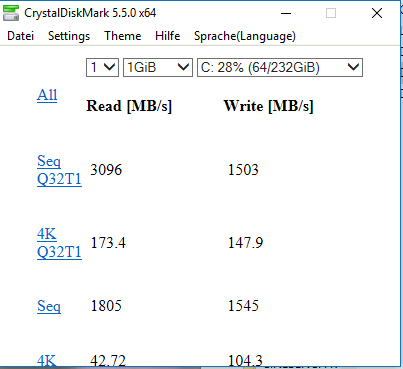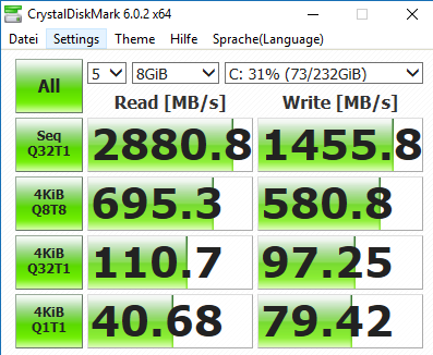 Betriebssystem: Mehrere ausprobiert: Manjaro KDE, OpenSUSE und Windows 10 (daraus auch der AS SSD Benchmark)