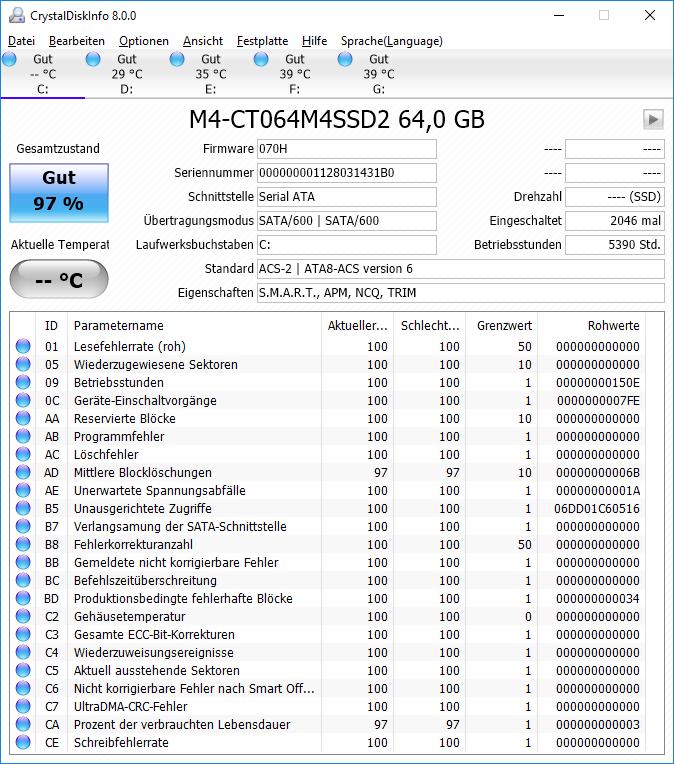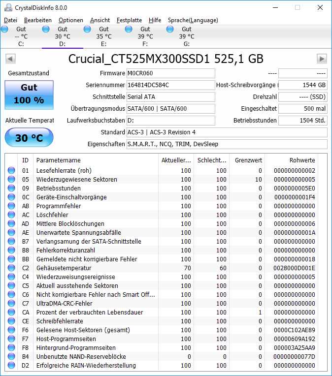 Vergleichst Du die Modelle auch mit der gleichen Kapazität? Die m4 ist mit 64GB nur die kleinste der Baureihe und die MX300 mit 525GB die zweit kleinste. Ziehen bitte bei CrystalDiskInfo immer die Screens so weit auf bis alle Attribute vollständig sichtbar sind, also keine Scrollbalken mehr erscheinen.WhoDat schrieb:ackt irgendwie etwas ab wenn ich die mit euren Werten bzw. den Angaben im Netz vergleiche.