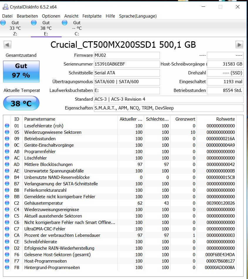 Die Bewertung sagt weniger aus als die meisten Leute glauben, da nur wenige Attribute dafür herangezogen werden. Die Prozentangaben sind auch nicht zwischen unterschiedlichen Herstellern vergleichbar, bei Crucial sind es die Prozente der verbleibenden spezifizierten P/E Zyklen, bei anderen wie den Samsung SSDs z.B. die der verbleibenden Reserve NANDs. Bei der MX300 wäre dies Attribut B4, aber dessen Aktueller Wert ist schon von Anfang an 0, würde CDI den nehmen, würde es immer 0% anzeigen, was auch nicht richtig wäre, Crucial hat da einfach Mist gebaut bei dem Attribut.WhoDat schrieb:CrystalDiskInfo steht Gesamtzustand Gut 100%