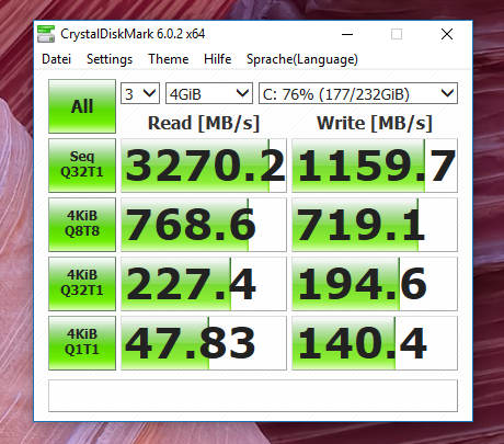 Die 970 Evo hat einen Pseudo-SLC Schreibcache, wenn der voll ist, dann schreibt sie sehr viel langsamer als die beworbenen Werte, von daher sollte man nach dem Booten erstmal warten und ggf. im Resoucen Monitor schauen bis sich alles beruhigt hat, dann benchen und vor dem nächsten Benchen am Besten rebooten, wieder warten...
