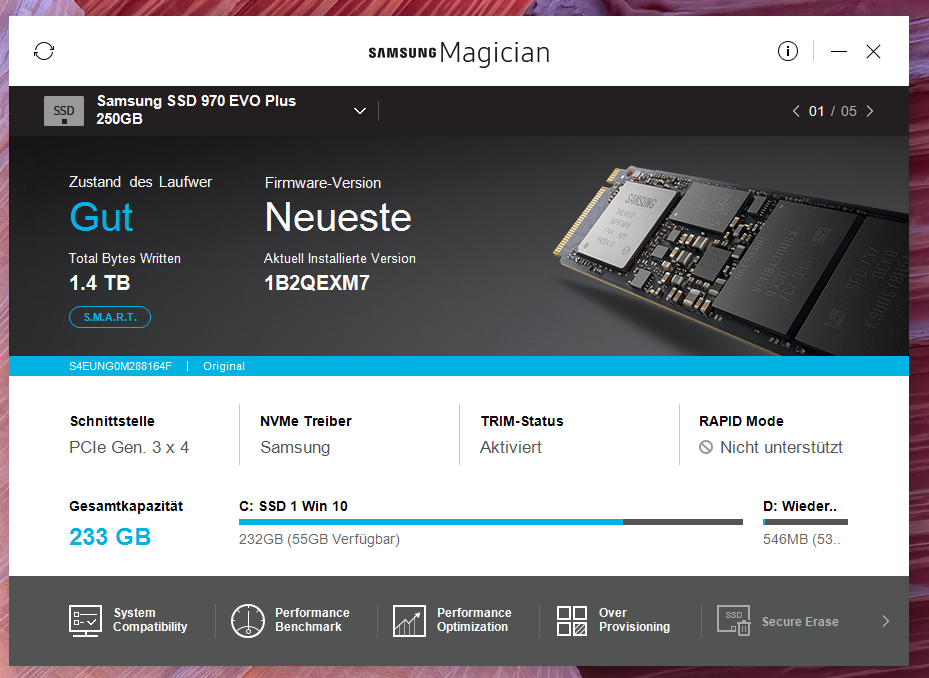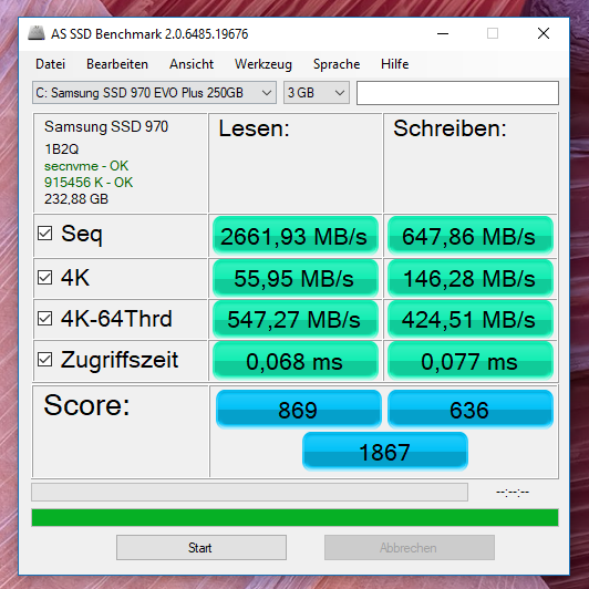 Die SSD ist auch über pci gen3 x4 angebunden und der Samsung Treiber ist auch drauf...