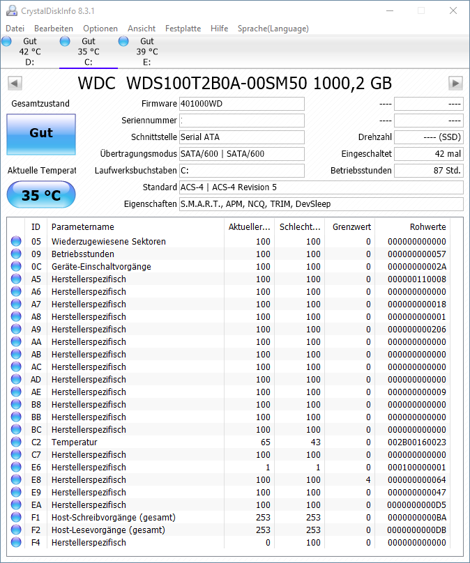 Fragen zu den SMART-Werten: Warum sehe ich bei der älteren Crucial SSD mehr Details als bei der neueren WD SSD? Bei WD steht größtenteil "herstellerspezifisch" und die Host-Schreibvorgänge, %-Werte für den Zustand (zb Gut 83%), werden nicht angezeigt.