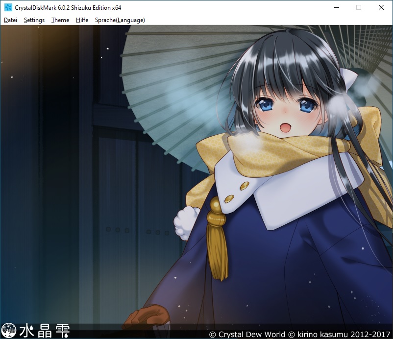 Ich habe jetzt mal CrystalDiskMark6_0_2 gestartet, was sehr komisch ist, dort fehlt überall der Hintergrund!? Habe dann die Shizuku Edition gestartet und dort fehlt überall die Schrift usw. Habe dann die Themen gewechselt und ab und zu waren die Schriften zum Einstellen und Starten sporadisch mal da und mal weg, was stimmt da nicht? Werte sehen ok aus oder?