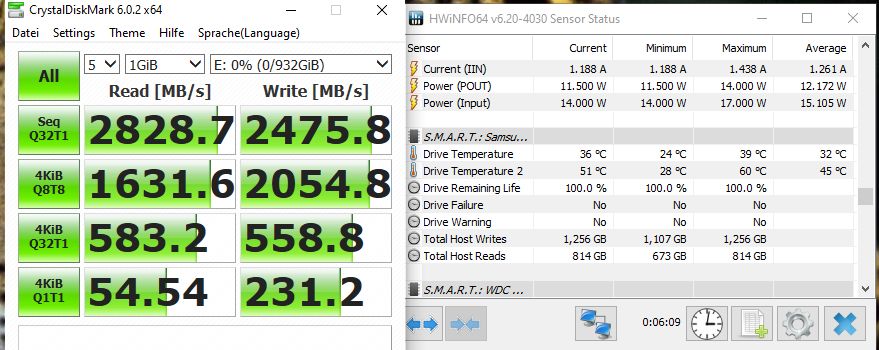 Die Lesegeschwindigkeit pendelte sich bei 2500MB/s ein was ja viel zu wenig ist. Die Temperatur ging aber durch die Decke. Ich hatte HWinfo mitlaufen und bei 90°C dachte ich mir erstmal "OHA" bis sie sogar 105° erreichte und ich CDM sofort beendete. Es ist ein ordentlicher Airflow mit 6 Lüftern vorhanden.