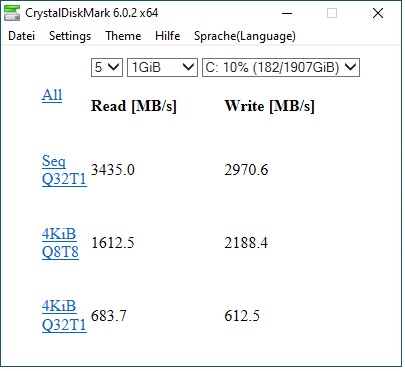Was die Geschwindigkeit angeht, so kann AS-SSD diese mit seinem einzelnen Zugriff gar nicht aus der SSD rauskitzeln, obwohl der über 16MB geht und damit sehr lang ist. Diese NVMe SSDs schaffen erst bei mehreren lange und parallelen Zugriffen ihre beworbenen Werte, weshalb CrystalDiskMark ab Version 6 auch von einem langen Zugriff auf 32 parallele über 128k und nun in Version auf 8 parallele Zugriffe über ja 1MB gewechselt hat.