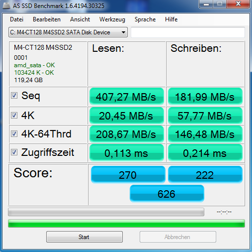 hmm.. so im direktvergleich mit meiner m4 (passt ja ganz gut da beides beinah untereinander gepostet ist) scheinen mir deine werte ein wenig zu schlecht zu sein o_O.. ich mein du hast die 120gb version ?! und dann solche werte die im vergleich zu meiner 64gb m4 deutlich schwächer sind (seq. sind ja die unwichtigsten werte von all denen)