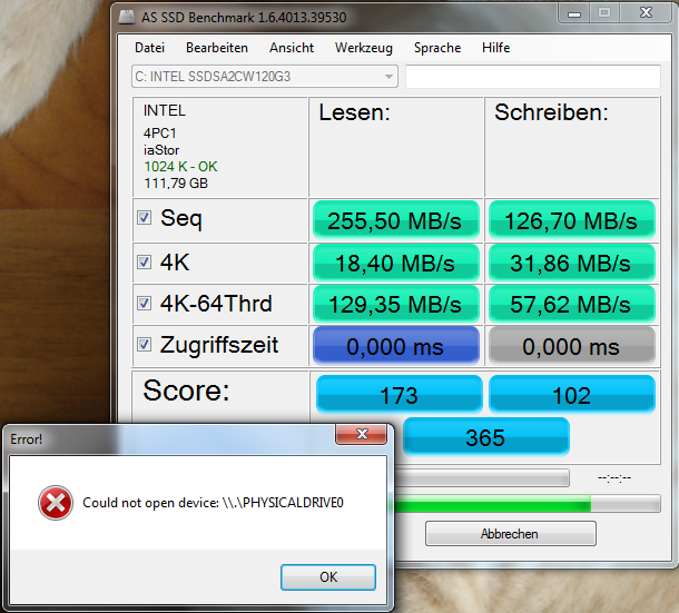 Bei Dir sind die 4k Werte schlechter geworden, was auf die Energiesparoptionen schliessen läßt. Lass mal Prime auf einem Kern während des Benchens laufen und teste auch mal im abgesicherten Modus.silent2k schrieb:Bei dem neuen PC hängt er sich auch am Ende auf (Fehlermeldung angehangen). Zusätzlich als Info noch ein Bild von Crystal Disk Info.