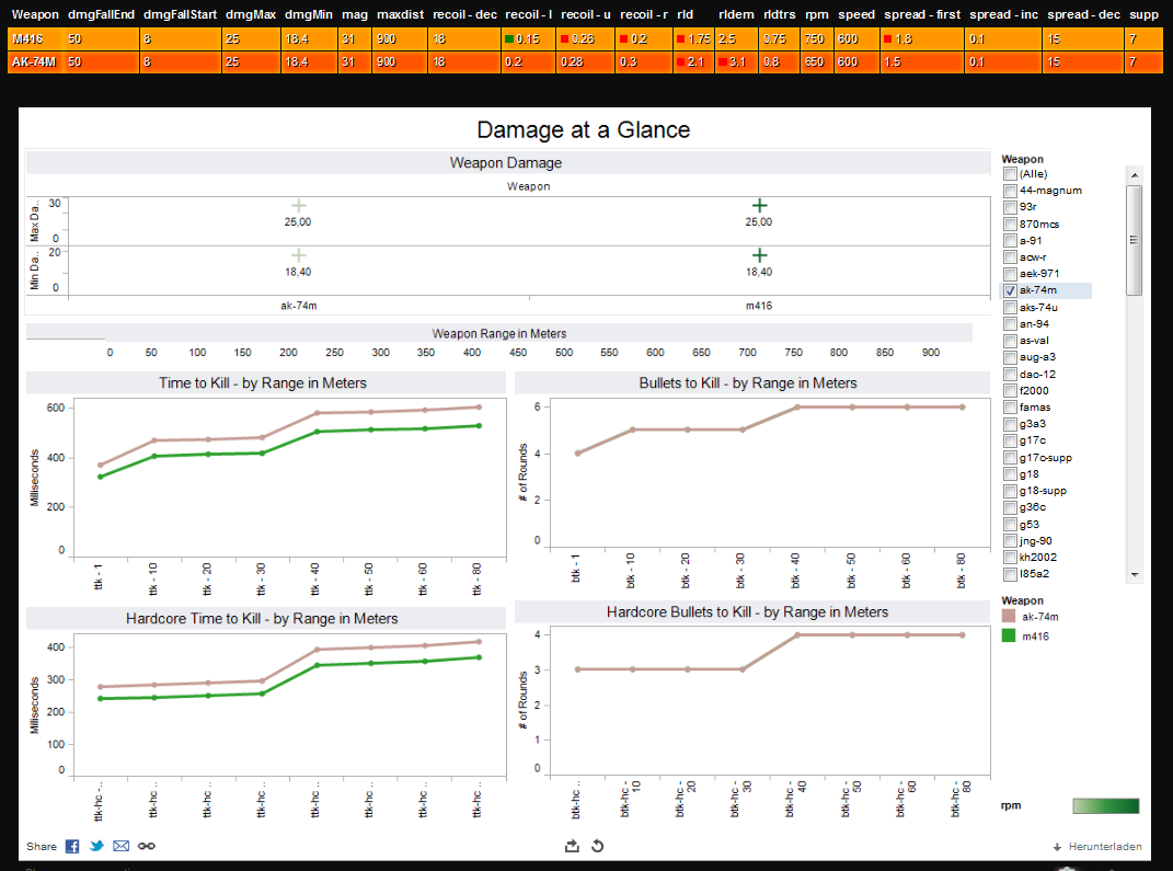 Und gerade dieser Unterschied von 50RPM macht das M16A3 meiner Meinung nach immer noch zur überlegenen Waffe. Dazu kommt dann noch, dass das Recoilverhalten gegenüber der HK416 angenehmer ist. Das M16 wandert praktisch nur nach rechts aus, bei ganz geringem Left Pull. Die HK416 wandert in der Summe zwar weniger aus, aber da der Left Pull höher ausfällt, ist das Verhalten imho schwieriger zu kontrollieren. Ergo ist also gerade der ausgeglichene horizontale Recoil ein Nachteil.