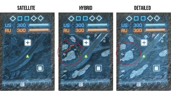 Meiner Meinung nach bietet Hybrid, soweit ich das auf den Screens sehe, derzeit für mich die beste Option. Während du bei Detailed (lol) nur einen großen hellblauen Klotz mit eine paar kleineren siehst, kannst du bei Hybrid noch den Berg (gelbe Punkte) und die deatillierten Wege dazwischen (rot).
