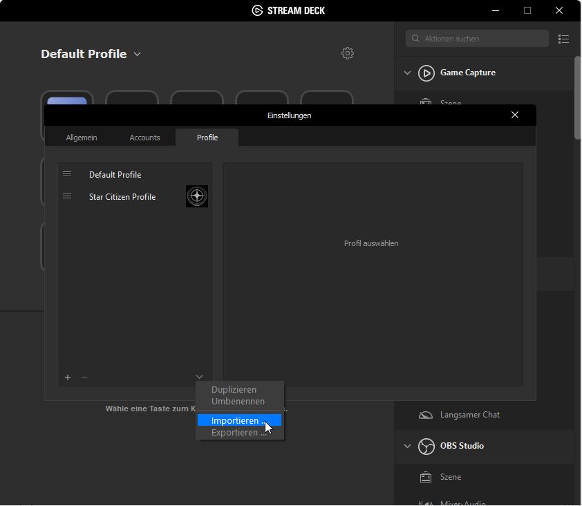 Kannst du mal kurz erklären bitte, wie ich das Profil aus dem Video in das Streamdeck einbinde? Mal ab von den ganzen Icons/Gifs, die dabei sind, gibt es ja einmal die Arius SC Keybindings und dann Arius Custom Star Citizen Profile. Mir erschließt sich da jetzt nicht, wie ich die beiden letztgenannten Dateien auf das Streamdeck übertrage, bzw im welchen Ordner der Installation ich diese packen muß. Denn die paar Gifs, die ich mir mal testweise auf das StreamDeck gezogen habe, sahen absolut klasse aus. Vielen Dank schon mal.