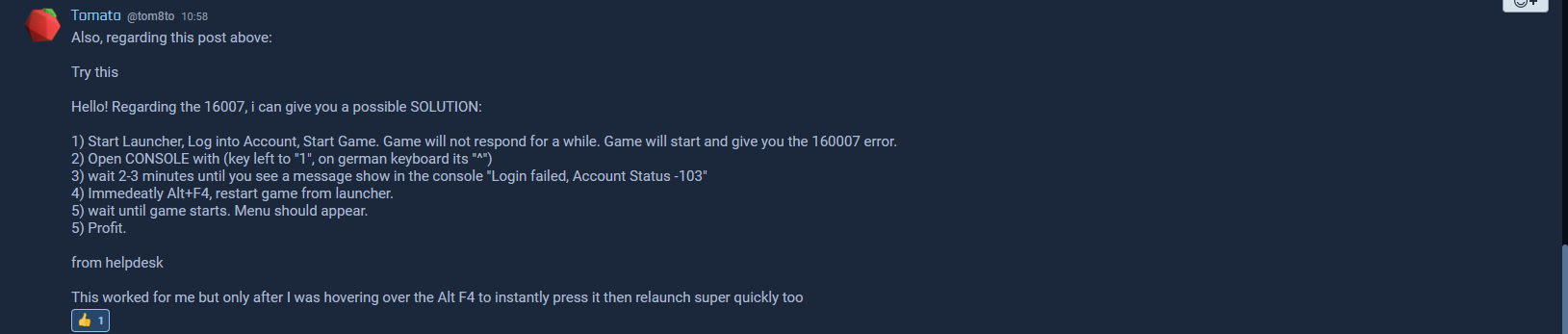 Ok so langsam wirds dann doch etwas nervig. Seit gestern abend bekomme ich Fehler 16007 nach dem Start des Spiels, komme nicht mal ins Hauptmenü. Habe alle möglichen Kombinationen an Workarounds versucht, Charakter Resets, Log In and Out, User Folder delete, Verify etc., nichts hilft...