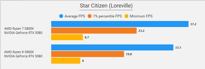 Also, der Ryzen 5800X rockt in Star Citizen wirklich, ist halt der SingleCore König und solange der Renderer nur auf einen Core rennt, macht das den größten Unterschied im Spiel, sieht man gerade auf Orison sehr gut was das ausmachen kann.