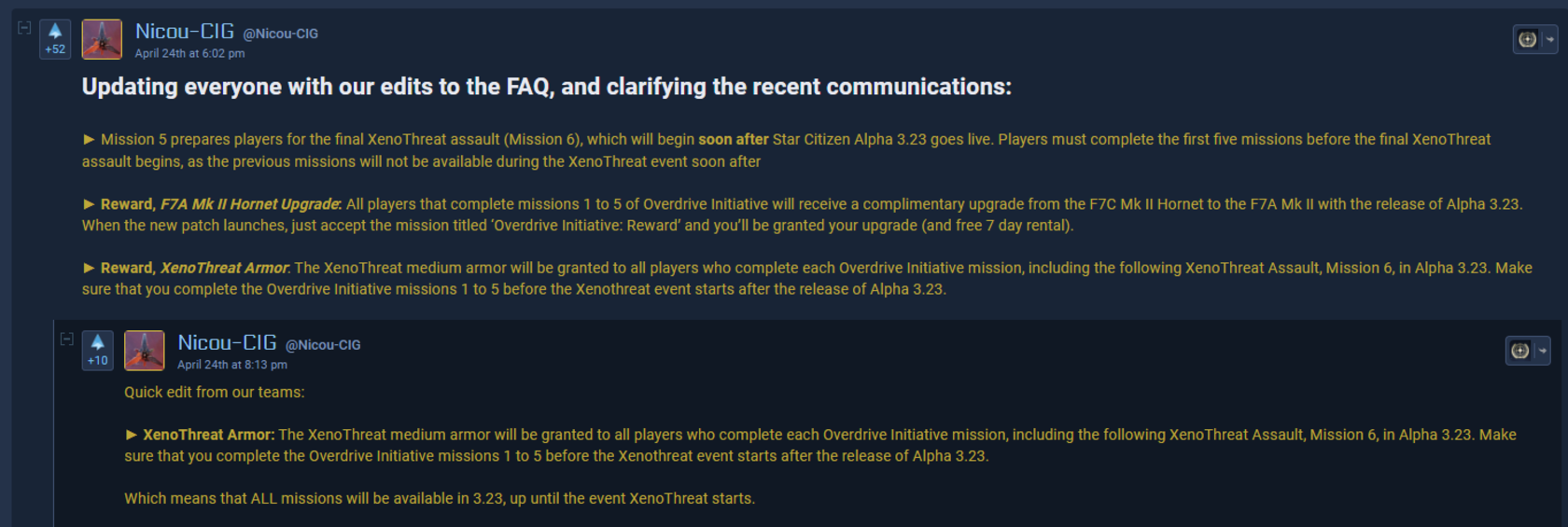 ► XenoThreat Armor: The XenoThreat medium armor will be granted to all players who complete each Overdrive Initiative mission, including the following XenoThreat Assault, Mission 6, in Alpha 3.23. Make sure that you complete the Overdrive Initiative missions 1 to 5 before the Xenothreat event starts after the release of Alpha 3.23.