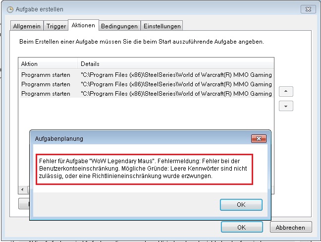 Wenn ich mit der Aufgabenplanung die höchsten Rechte erzwingen will, krieg ich einen Windows Fehler, siehe Anhang.