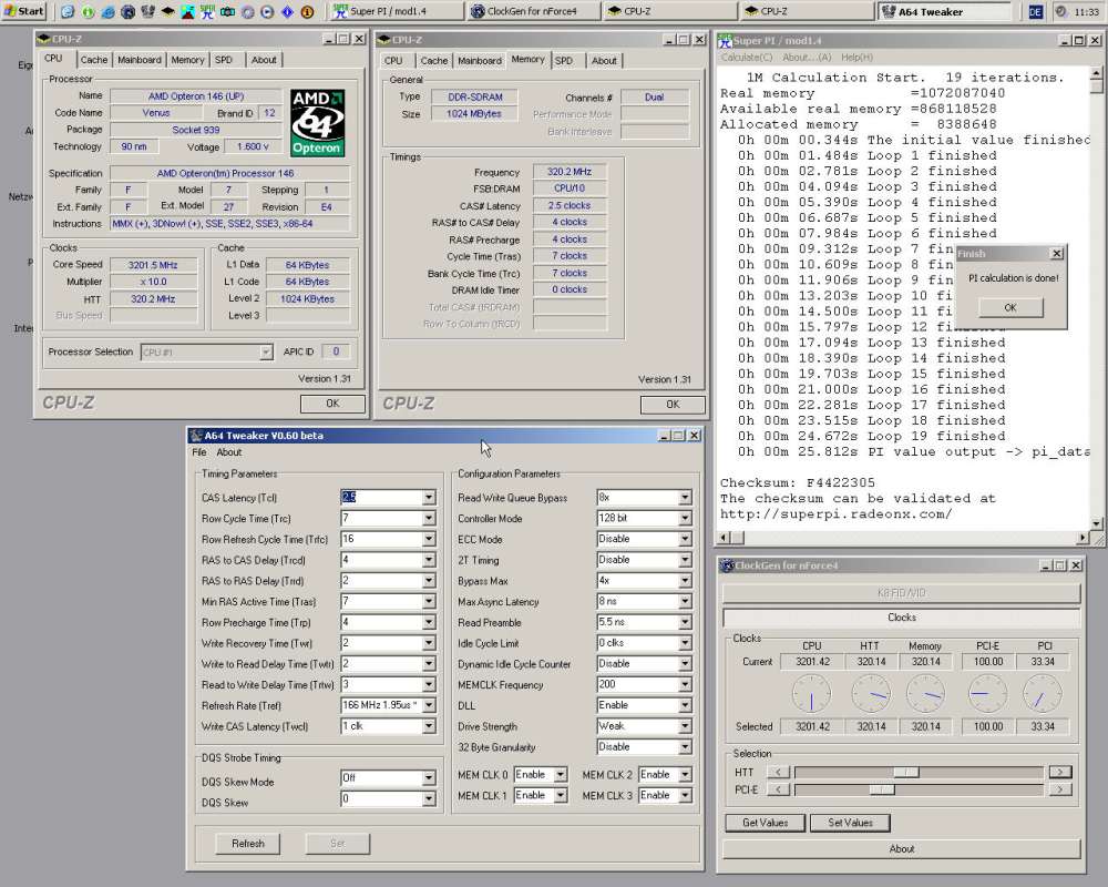 (ok, bevor ich mich schlagen lasse: mit dem opteron (148) habe ich inzwischen sogar 23,64 sekunden als bestwert gesehen bisher, @329x11=3620mhz - und ram 263mhz 2,0/2/2/5)