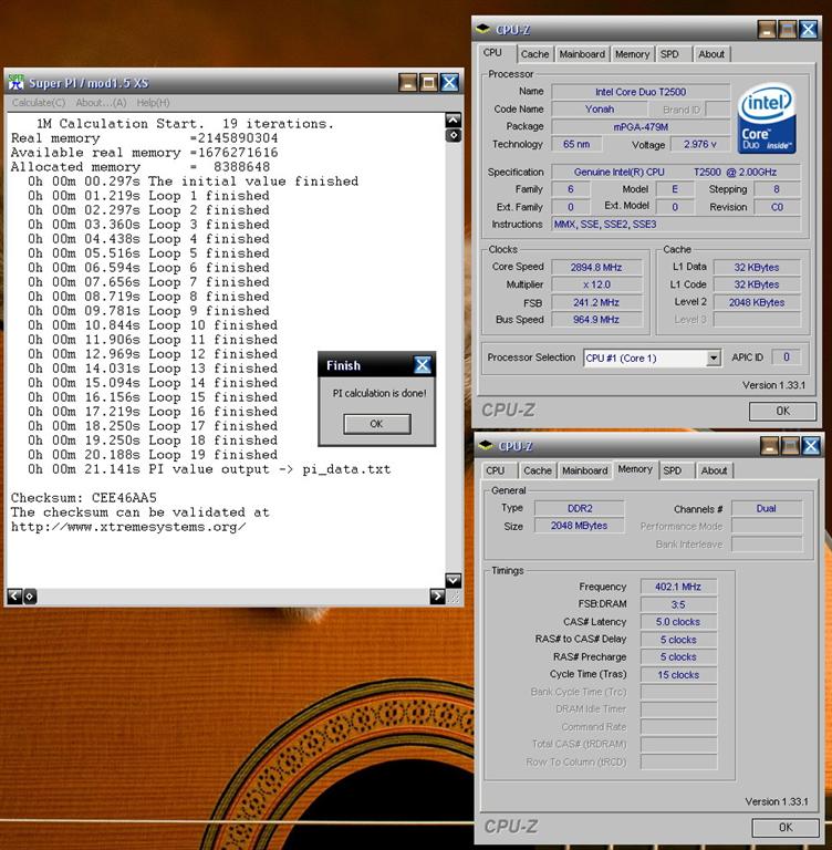 Gonzo71 / Intel CoreDuo T2500 @ 2895MHz / VCore 1.5 / FSB241 / 2x 1024MB Kingston HyperX DDR2-800 @ 402MHz @ 5-5-5-15 / LuKü / 21.141s