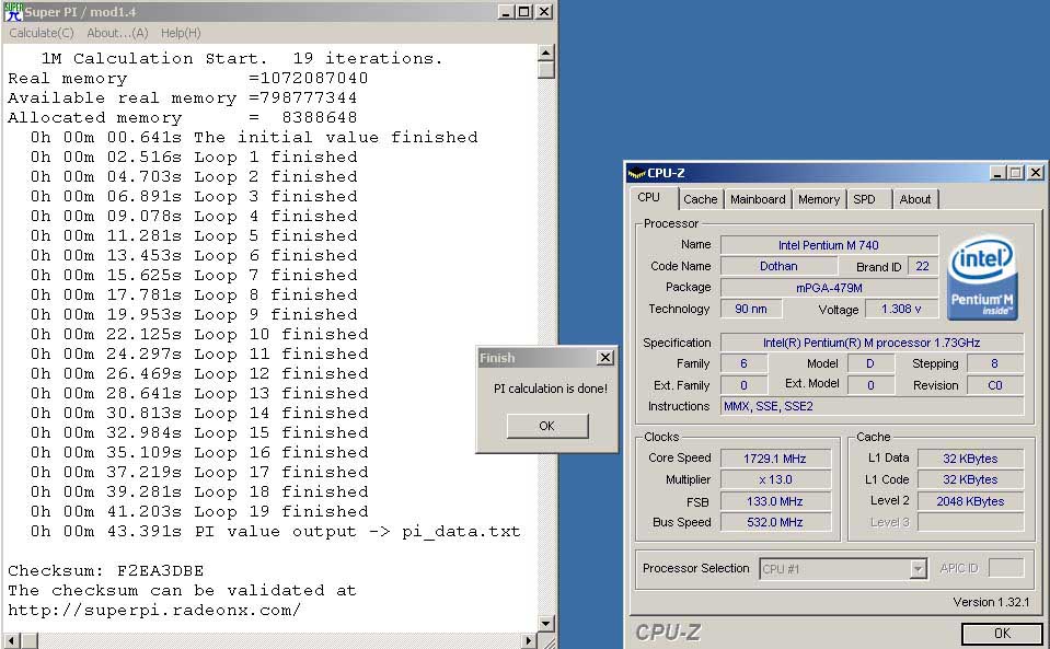 HugeXL / Pentium M 730 @ 2805MHz / Vc 1,55V / FSB 255 / 2x512 Corsair XMS C2PRO PC3200 CL 2,5-3-3-6 / Lukü / 26,468s