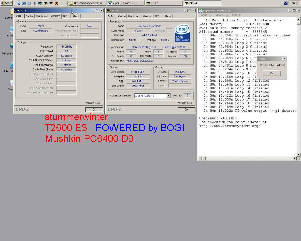 stummerwinter / Intel CoreDuo T2600 @ 3238Mhz / Vc 1.50 / FSB 249 / 2x 512 MB Muskin D9 DDR2-800 @ 415 Mhz CL 4-4-3-10 / Lukü / 18,922 s