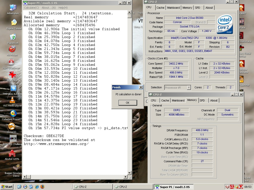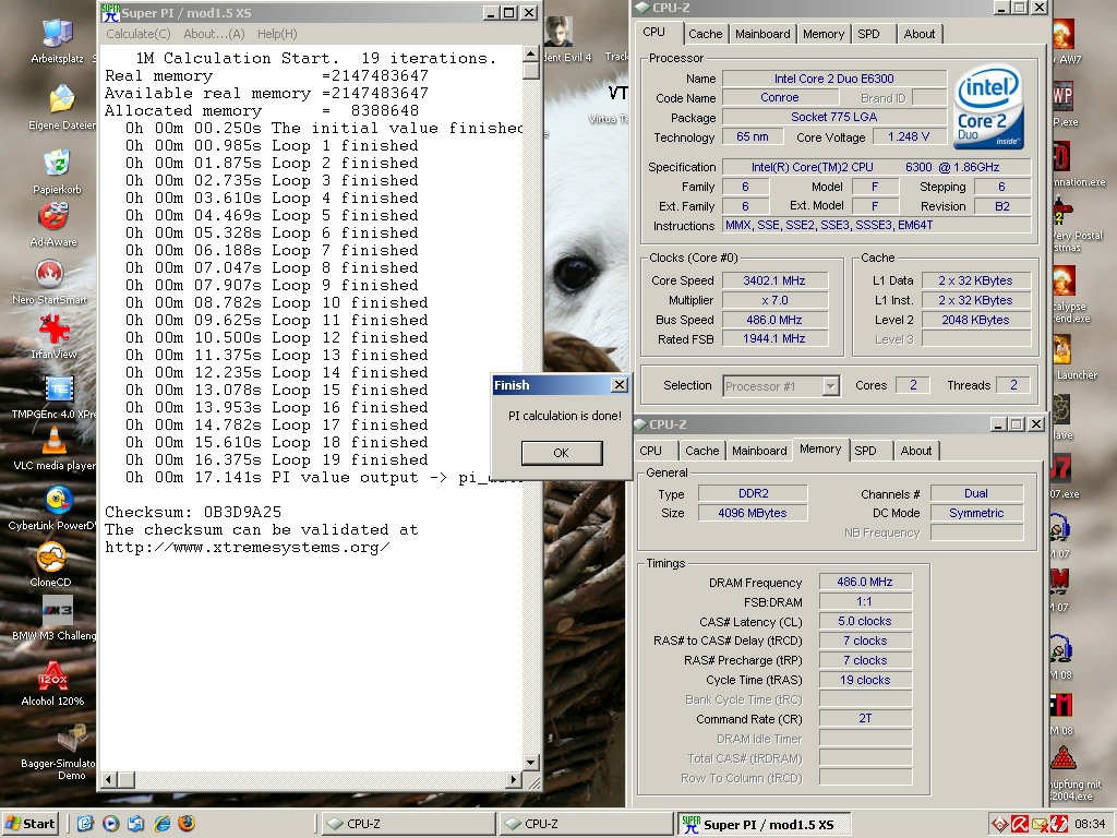 So, hier mal mein E6300@3.400 MHz. Gekühlt wird mein E6300 mit dem Scythe Andy Samurai Matser. Habe einmal einen Screen mit dem 1M-Mod und einen mit dem 32M-Mod gemacht. Beachtet mal die vcore! Ich bin mir sicher, wenn mein Asus P5K Pro da ist, werde ich die 4 Ghz Marke knacken können.
