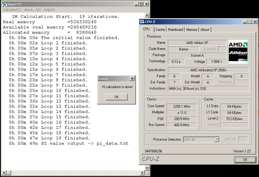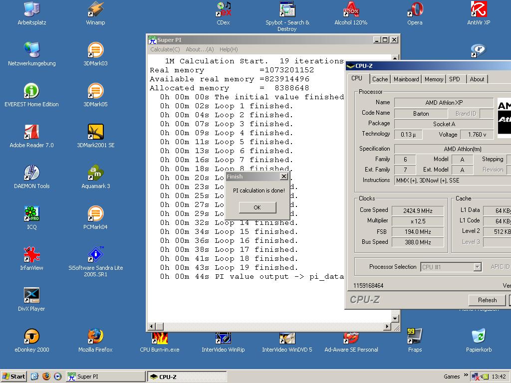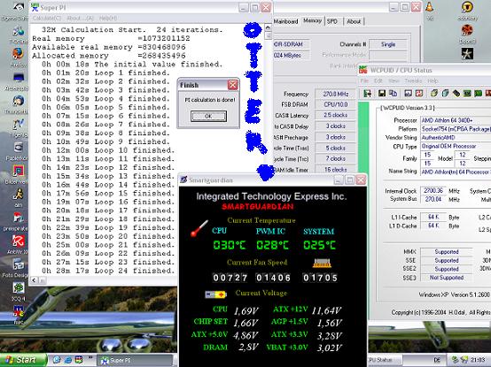 - Barton-oc: 44 s superpi ist gut mit einem barton und "nur" fsb 194. ohne voltmod für die nb gehen (stabil) so rund 230mhz mit 'nem nf7 z.b. und dann sind so 230x12=2.760 @2,0/2/2/5 zunächst eine relativ natürlich grenze. und das macht superpi 37 sekunden. wer also schneller sein wollte mit einem barton (der ja keine direkte speicheranbindung hat), der muss dann sein board volt-modden für 1.9 volt nb - und eine vapochill für die cpu aussuchen, für vielleicht 2.940mhz @ 12x245. machte evtl. 34s superpi. (man kauft aber besser einen