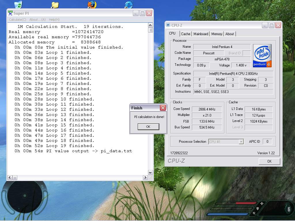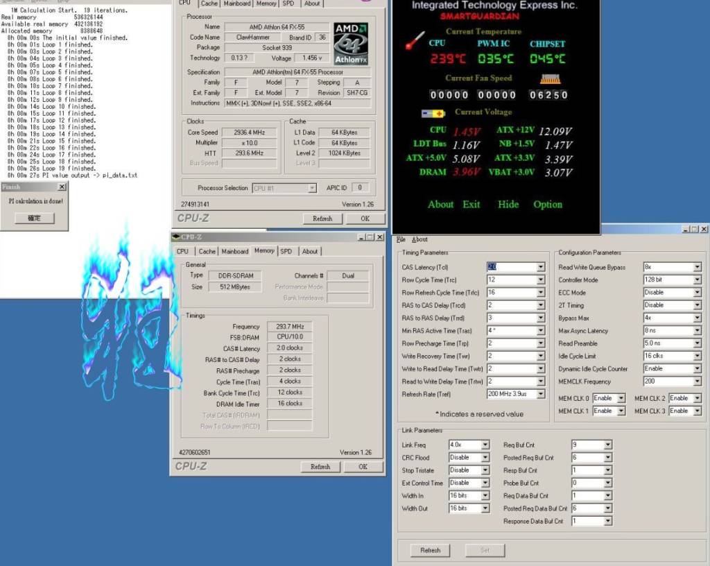 Athlon FX55 (350x8) 2800MHZ 1.50 Volt (default) , DDR700 2.5-3-3-8 (OCZ Gold VX @3.8 Volt)