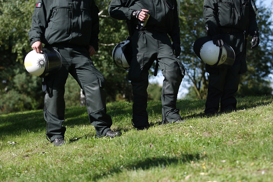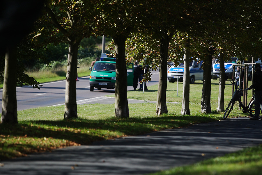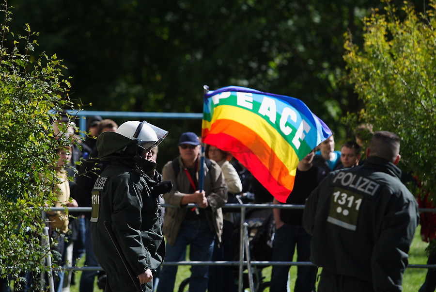 So, mal was aus dem rauen Reportage-Einsatz. War eine ziemlich unwirkliche Stimmung; einige Hundert Rechte (wie im Zoo, der Vergleich drängte sich bei aller gebotenen Sachlichkeit auf) eingezäunt, mehrere tausend Linke drumrum und mitten drin ebenfalls mehrere tausend Polizisten.